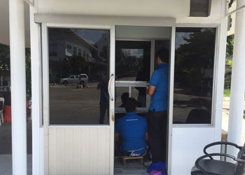 หลังจากที่ช่างแขกได้เห็นหน้างานช่างแขกก็ได้นำเสนอตัวอย่างฟิล์ม 3M รุ่น FX HP-5 เป็นฟิล์มดำ 80% ซึ่งกันความร้อนได้ดี ไม่ปรอท ไม่มีแสงสะท้อนมารบกวนผู้มาติดต่อราชการ และเป็นฟิล์มที่มีความเข้มสูง เวลาที่มองจากภายในออกมาภายนอกก็มองเห็นได้ชัดเจน ซึ่งเหมาะกับอาคารช่องทางด่วนของเรา ที่ตั้งอยู่กลางแจ้ง มีเพียงหลังคาบังแดดเท่านั้น ซึ่งตอนกลางวันอากาศจะร้อนมาก และอุณหภูมิภายในสำนักงานช่องทางด่วนก็สูงตาม ถึงแม้จะเปิดแอร์ตลอดเวลาที่ปฏิบัติงาน