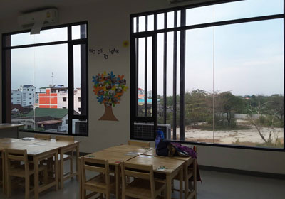 และอาจจะกระทบไปถึงการเรียน เด็กๆเวลาที่เขาร้อนเขาจะไม่มีสมาธิ เขาจะกระวนกระวายใจ ดังนั้นฉันจึงเข้าไปหาข้อมูลเกี่ยวกับเรื่องสถานที่มีกระจกล้อมรอบ ควรจะมีวิธีลดความร้อนของแสงแดดที่ส่องผ่านเข้ามาได้ยังไง และฉันก็ได้โทรไปปรึกษากับทางช่างแขกว่าควรจะทำยังไงดี