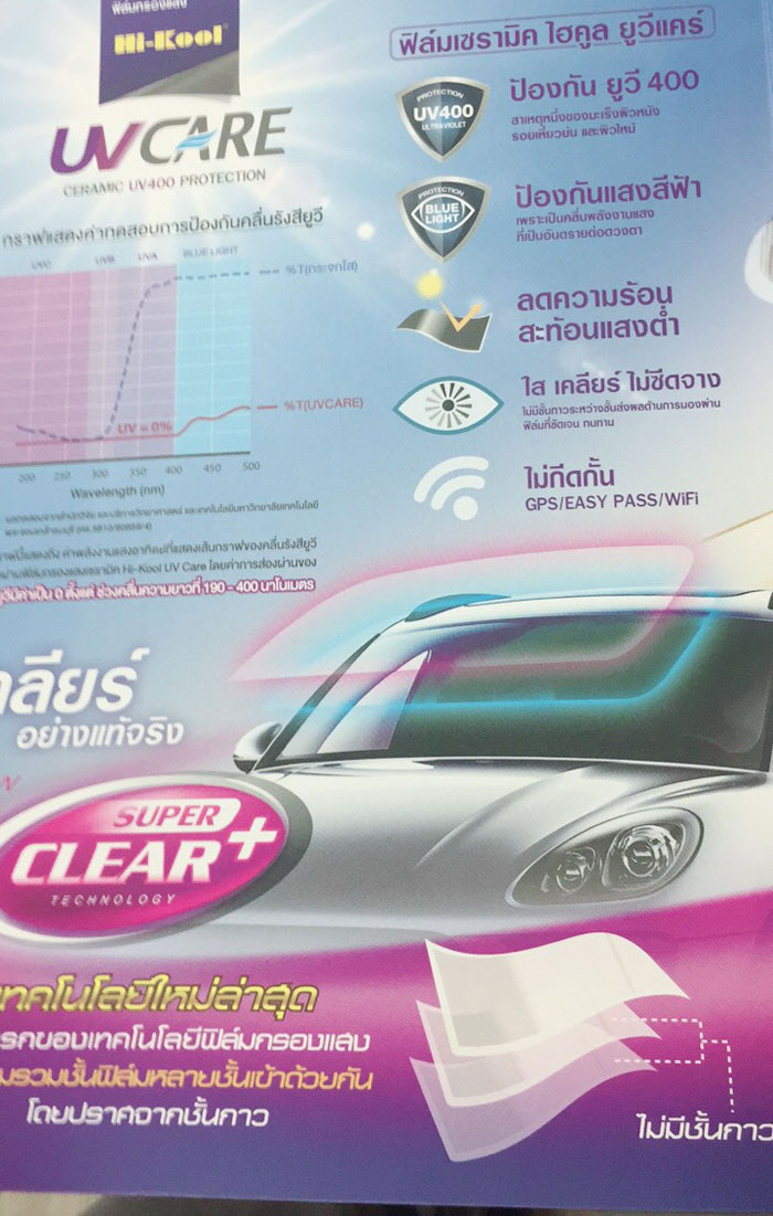 แต่ฟังแล้วก็คิดว่าถ้าจะให้ดีควรให้ช่างแขกแนะนำจะดีกว่าว่าฟิล์มยี่ห้อไหนจะเหมาะกับรถของฉันมากที่สุดคะ ช่างแขกแนะนำว่าว่าจะติดฟิล์มกรองแสงรถยนต์ยี่ห้อ Hikool UVCARE400 Ceramic จะเหมาะสมกับรถ BENZ ของฉันที่สุดคะ เพราะฟิล์มกรองแสงรถยนต์รุ่นนี้จะป้องกันรังสี UV400 ป้องกันแสงสีฟ้าซึ่งเป็นสาเหตุของการเกิดฝ้า กระ ลดความร้อนจากแสงแดดได้สูง สะท้อนแสงต่ำ เวลามองออกไปข้างนอกภาพใส เคลียร์ ไม่ซีดจาง ซึ่งเหมาะสมกับรถยนต์หรูของดิฉันที่สุดแล้วคะ