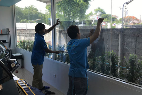 เมื่อตัดแบบเสร็จช่างจะทำการฉีดน้ำที่กระจก และฟิล์ม ก่อนติดตั้งจะต้องมี
