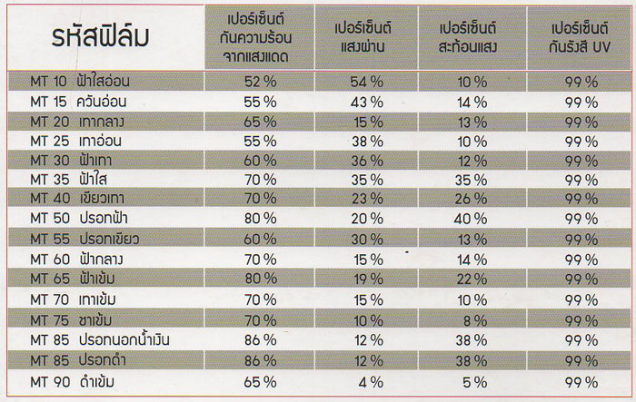 - มีคุณสมบัติกันความร้อนสูง 60-80%เนื่องจากแผ่นฟิล์มถูกเคลือบด้วยชั้นละอองโลหะที่สามารถสะท้อนความร้อนและกันความร้อนได้ดี